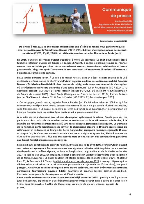 En 2026, l’univers de Franck Putelat s’apprête à vivre un tournant. Le chef doublement étoilé Michelin, Meilleur Ouvrier de France et Bocuse d’Argent, a conçu les premiers mois de l’année comme une véritable partition, où se succéderont soutien, transmission, célébration et haute gastronomie. Vingt ans après l’ouverture de son restaurant à Carcassonne, il revient à l’essentiel : l’excellence, l’amitié et le partage.