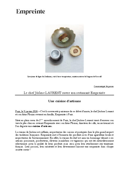 C’est la nouveauté parisienne de ce début d’année, le chef Jérôme Laurent et son frère Florian ouvrent en famille, Empreinte à Paris. Le chef Jérôme Laurent vient d’exaucer son vœu le plus cher en ouvrant Empreinte avec son frère Florian, directeur de salle, un restaurant où l’on déguste une cuisine d’artisans.