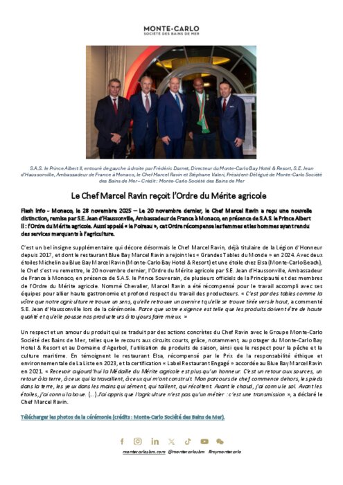 Le 20 novembre dernier, le chef Marcel Ravin a reçu une nouvelle distinction, remise par S.E. Jean d’Haussonville, Ambassadeur de France à Monaco, en présence de S.A.S. le Prince Albert II : l’Ordre du Mérite agricole. Aussi appelé « le Poireau », cet Ordre récompense les femmes et les hommes ayant rendu des services marquants à l’agriculture. C’est un bel insigne supplémentaire qui décore désormais le chef Marcel Ravin, déjà titulaire de la Légion d’Honneur depuis 2017, et dont le restaurant Blue Bay Marcel Ravin a rejoint les « Grandes Tables du Monde » en 2024.