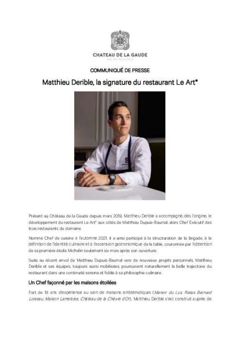 Présent au Château de la Gaude depuis mars 2019, Matthieu Derible a accompagné, dès l’origine, le développement du restaurant Le Art* aux côtés de Matthieu Dupuis-Baumal, alors Chef Exécutif des trois restaurants du domaine.