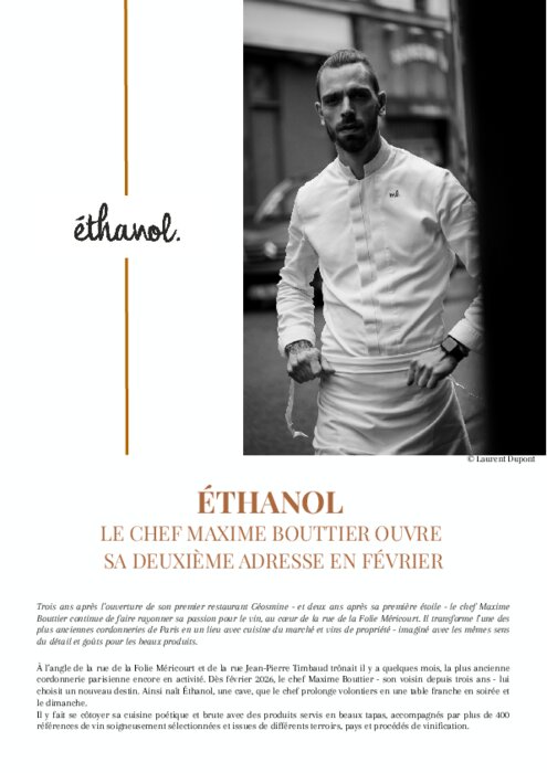 Trois ans après l’ouverture de son premier restaurant Géosmine - et deux ans après sa première étoile - le chef Maxime Bouttier continue de faire rayonner sa passion pour le vin, au coeur de la rue de la Folie Méricourt. Il transforme l’une des plus anciennes cordonneries de Paris en un lieu avec cuisine du marché et vins de propriété - imaginé avec les mêmes sens du détail et goûts pour les beaux produits.