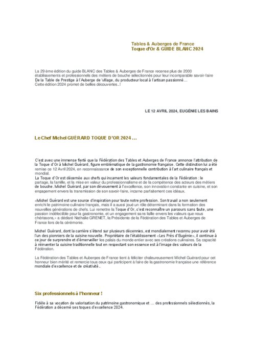 C’est avec une immense fierté que la Fédération des Tables et Auberges de France annonce l’attribution de la Toque d’Or à Michel Guérard, figure emblématique de la gastronomie française. Cette distinction lui a été remise ce 12 Avril, en reconnaissance de son exceptionnelle contribution à l’art culinaire français et mondial. La Toque d’Or est décernée aux chefs qui incarnent les valeurs fondamentales de la Fédération : le partage, la famille, et la mise en valeur du professionnalisme et de la compétence des acteurs des métiers de bouche. Michel Guérard, par son dévouement à l’excellence, son innovation constante en cuisine, et son engagement envers la transmission de son savoir-faire, incarne parfaitement ces idéaux.