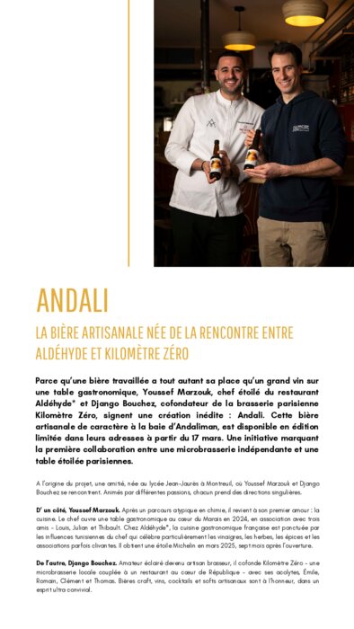 Parce qu’une bière travaillée a tout autant sa place qu’un grand vin sur une table gastronomique, Youssef Marzouk, chef étoilé du restaurant Aldéhyde et Django Bouchez, cofondateur de la brasserie parisienne Kilomètre Zéro, signent une création inédite : Andali. Cette bière artisanale de caractère à la baie d’Andaliman, est disponible en édition limitée dans leurs adresses à partir du 17 mars. Une initiative marquant la première collaboration entre une microbrasserie indépendante et une table étoilée parisiennes.