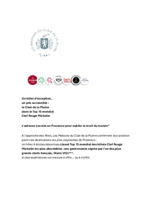 À l’approche des fêtes, Les Maisons du Clair de la Plume confirment leur position parmi les destinations les plus inspirantes de Provence : un hôtel 4 étoiles désormais classé Top 15 mondial des hôtels Clef Rouge Michelin les plus abordables, une gastronomie signée par l’un des plus grands chefs français, Glenn Viel, et des expériences sur mesure.