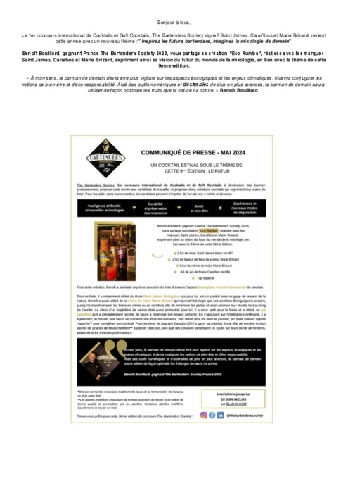 Le 1er concours international de Cocktails et Soft Cocktails, The Bartenders Society signé Saint James, Caraïbos et Marie Brizard, revient cette année avec un nouveau thème : "Inspirez les futurs bartenders, imaginez la mixologie de demain"
