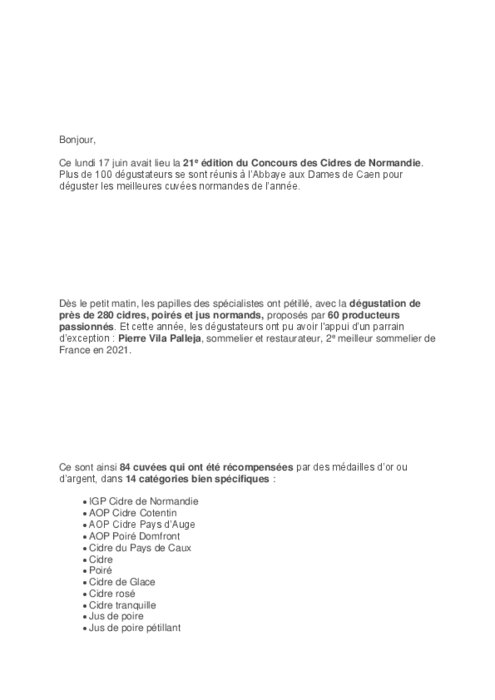 Ce lundi 17 juin avait lieu la 21e édition du Concours des Cidres de Normandie. Plus de 100 dégustateurs se sont réunis à l’Abbaye aux Dames de Caen pour déguster les meilleures cuvées normandes de l’année. Dès le petit matin, les papilles des spécialistes ont pétillé, avec la dégustation de près de 280 cidres, poirés et jus normands, proposés par 60 producteurs passionnés. Et cette année, les dégustateurs ont pu avoir l'appui d’un parrain d’exception : Pierre Vila Palleja, sommelier et restaurateur, 2e meilleur sommelier de France en 2021.