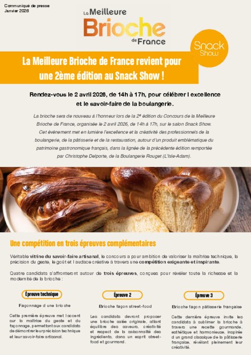 Le Snack Show met de nouveau la brioche à l’honneur avec la 2ᵉ édition du concours de La Meilleure Brioche de France, qui se tiendra le 2 avril, de 14h à 17h. Dédié à un produit emblématique du patrimoine gastronomique français et tendance forte du snacking, ce concours met en lumière l’excellence, la technicité et la créativité des professionnels de la boulangerie, de la pâtisserie et de la restauration. Après une première édition remportée par Christophe Delporte (Boulangerie Rouget, L’Isle-Adam), quatre candidats s’affronteront cette année autour de trois épreuves complémentaires.