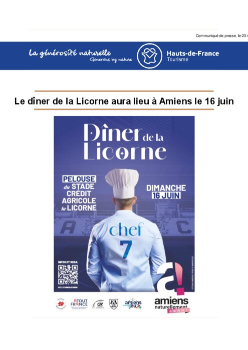 Le premier Dîner de la Licorne aura lieu le dimanche 16 juin à Amiens, au stade de la Licorne Crédit Agricole. Organisé par Amiens Métropole avec le soutien d’Atout France, en partenariat avec l’ASC, cet évènement s’inscrit à la fois dans la dynamique de promotion de la gastronomie amiénoise et dans la démarche de célébration des valeurs de l’olympisme, Amiens se prend au Jeu. L'objectif : donner l'image d'une destination qui mêle créativité et excellence, mais surtout offrir aux convives un moment inoubliable.