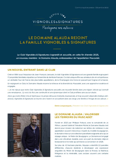 Créé en 1984 sous l’impulsion de Jean-François Janoueix, le Club Vignobles & Signatures est une grande famille regroupant 17 propriétés familiales réparties sur l’ensemble du territoire français. Ce club unique offre aux amateurs de vins et spiritueux un véritable Tour de France des plus belles appellations, de la Champagne à la Corse en passant par Cognac et la Savoie.