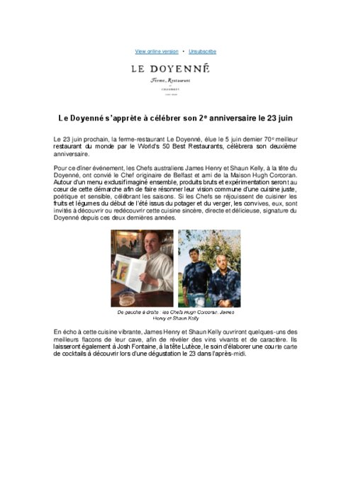 Le 23 juin , la ferme-restaurant Le Doyenné, élue le 5 juin dernier 70e meilleur restaurant du monde par le World’s 50 Best Restaurants, célèbrera son deuxième anniversaire. Pour ce dîner événement, les chefs australiens James Henry et Shaun Kelly, à la tête du Doyenné, ont convié le Chef originaire de Belfast et ami de la Maison Hugh Corcoran. Autour d’un menu exclusif imaginé ensemble, produits bruts et expérimentation seront au cœur de cette démarche afin de faire résonner leur vision commune d’une cuisine juste, poétique et sensible, célébrant les saisons.