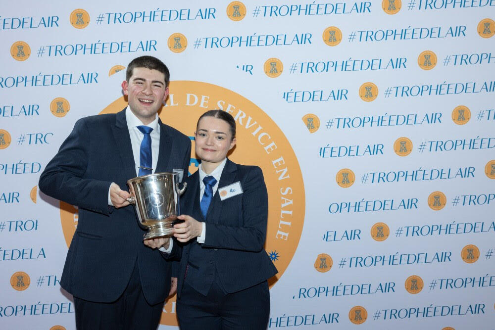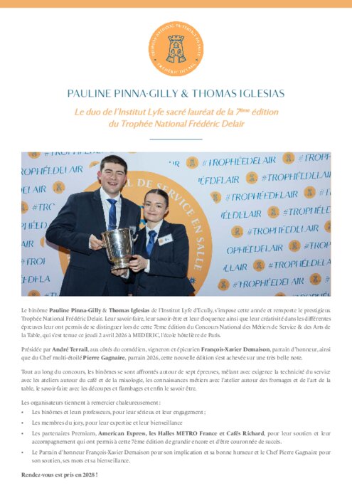 Le binôme Pauline Pinna-Gilly & Thomas Iglesias de l’Institut Lyfe d’Ecully, s’impose cette année et remporte le prestigieux Trophée National Frédéric Delair. Leur savoir-faire, leur savoir-être et leur éloquence ainsi que leur créativité dans les différentes épreuves leur ont permis de se distinguer lors de cette 7ème édition du Concours National des Métiers de Service & des Arts de la Table, qui s’est tenue ce jeudi 2 avril à Mederic, l’école hôtelière de Paris.