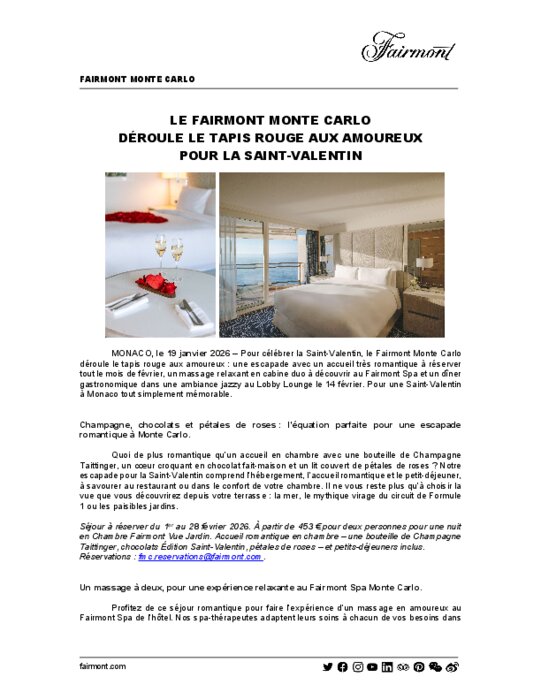 Pour célébrer la Saint-Valentin, le Fairmont Monte Carlo déroule le tapis rouge aux amoureux : une escapade avec un accueil très romantique à réserver tout le mois de février, un massage relaxant en cabine duo à découvrir au Fairmont Spa et un dîner gastronomique dans une ambiance jazzy au Lobby Lounge le 14 février. Pour une Saint-Valentin à Monaco tout simplement mémorable.