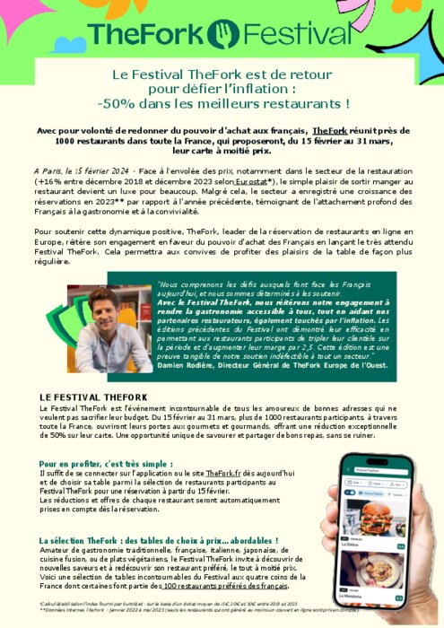 Avec pour volonté de redonner du pouvoir d’achat aux français, TheFork réunit près de 1000 restaurants dans toute la France, qui proposeront, du 15 février au 31 mars, leur carte à moitié prix. Le Festival TheFork est l’événement incontournable de tous les amoureux de bonnes adresses qui ne veulent pas sacrifier leur budget.