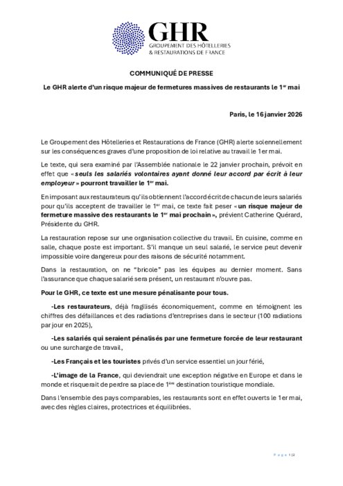 Le Groupement des Hôtelleries et Restaurations de France (GHR) alerte solennellement sur les conséquences graves d’une proposition de loi relative au travail le 1er mai. Le texte, qui sera examiné par l’Assemblée nationale le 22 janvier prochain, prévoit en effet que « seuls les salariés volontaires ayant donné leur accord par écrit à leur employeur » pourront travailler le 1er mai.