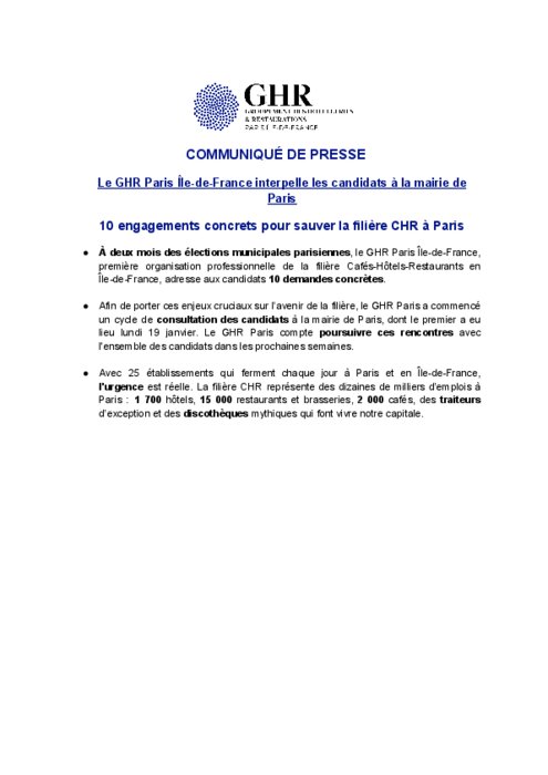 À deux mois des élections municipales parisiennes, le GHR Paris Île-de-France, première organisation professionnelle de la filière Cafés-Hôtels-Restaurants en Île-de-France, adresse aux candidats 10 demandes concrètes.