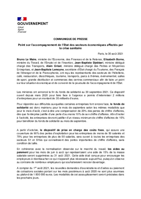 A l'issue de la réunion, il a annoncé une rallonge d'un mois pour le fonds de solidarité jusqu'à fin septembre, selon les mêmes modalités qu'en août (indemnisation à hauteur de 20% du chiffre d'affaires) mais avec une nouvelle condition, ajoutée par Bercy afin d'éviter les "effets d'aubaine" pour ceux qui préfèrent rester fermés et toucher des aides: réaliser au minimum 15% de son chiffre d'affaires d'avant-crise.