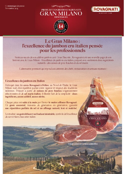 Fabriqué dans les caves Rovagnati à Felino, au Nord de l’Italie, le Gran Milano naît d’un équilibre parfait entre rigueur et respect des traditions italiennes. Préparé à partir de cuisses de porc fraîches soigneusement sélectionnées et de sel marin italien, il illustre l’art de la simplicité : deux ingrédients, aucun additif, aucun nitrite.
