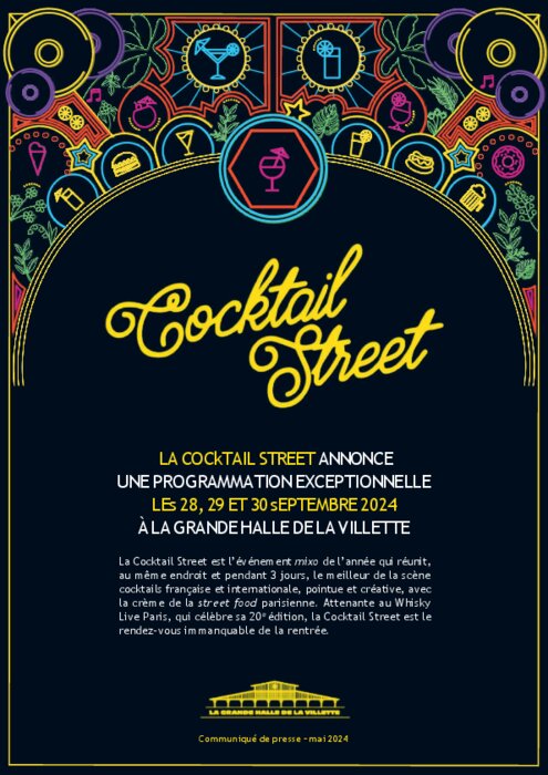 La Cocktail Street est l’événement mixo de l’année qui réunit, au même endroit et pendant 3 jours, le meilleur de la scène cocktails française et internationale, pointue et créative, avec la crème de la street food parisienne. Attenante au Whisky Live Paris, qui célèbre sa 20e édition, la Cocktail Street est le rendez-vous immanquable de la rentrée.