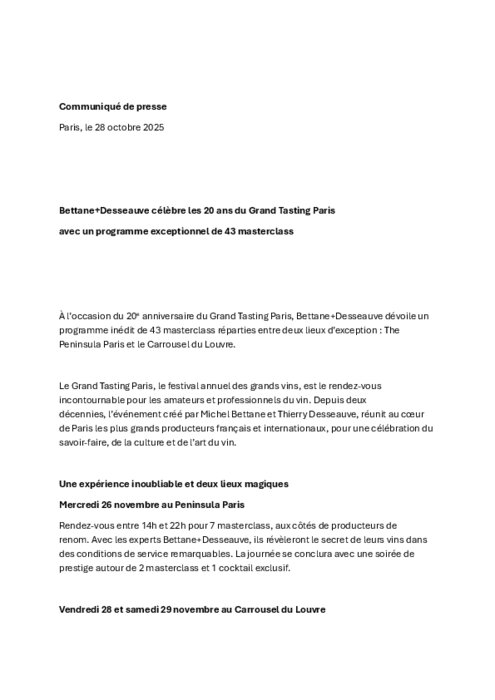 Le Grand Tasting Paris, le festival annuel des grands vins, est le rendez-vous incontournable pour les amateurs et professionnels du vin. Depuis deux décennies, l’événement créé par Michel Bettane et Thierry Desseauve, réunit au cœur de Paris les plus grands producteurs français et internationaux, pour une célébration du savoir-faire, de la culture et de l’art du vin.