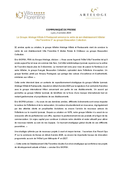 Restauration commerciale 02 octobre 2025 - 16:45 32 années après sa création, le groupe hôtelier Arteloge Hôtels et Restaurants vient de conclure la vente de son établissement Villa Florentine 5 étoiles Relais & Châteaux au groupe Beauvallon Collection. PDF (204 Ko) Télécharger