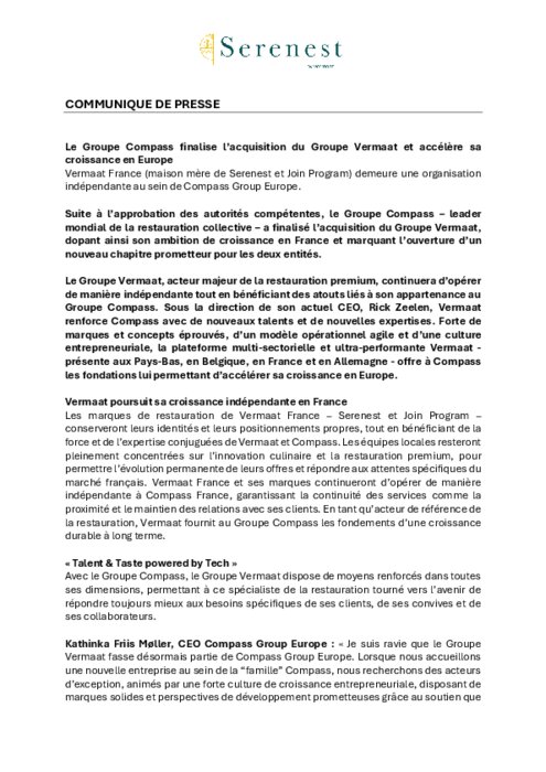 Suite à l’approbation des autorités compétentes, le Groupe Compass – leader mondial de la restauration collective – a finalisé l’acquisition du Groupe Vermaat, dopant ainsi son ambition de croissance en France et marquant l’ouverture d’un nouveau chapitre prometteur pour les deux entités.