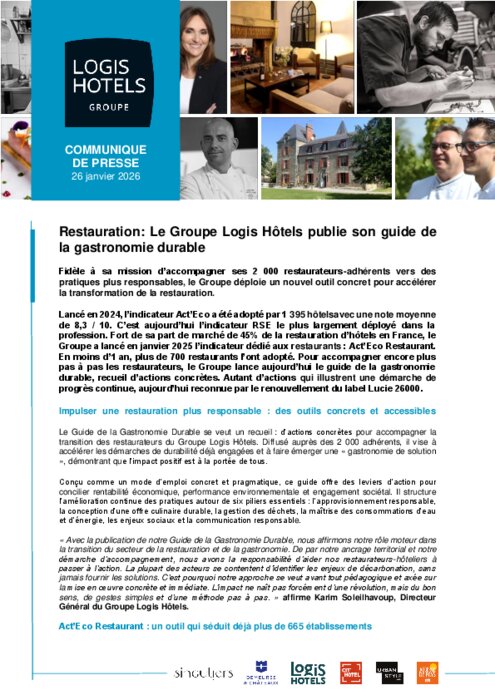 Lancé en 2024, l’indicateur Act’Eco a été adopté par 1 395 hôtels avec une note moyenne de 8,3 / 10. C’est aujourd’hui l’indicateur RSE le plus largement déployé dans la profession. Fort de sa part de marché de 45% de la restauration d’hôtels en France, le Groupe a lancé en janvier 2025 l’indicateur dédié aux restaurants : Act’Eco Restaurant. En moins d’1 an, plus de 700 restaurants l’ont adopté. Pour accompagner encore plus pas à pas les restaurateurs, le Groupe lance aujourd’hui le guide de la gastronomie durable, recueil d’actions concrètes. Autant d’actions qui illustrent une démarche de progrès continue, aujourd’hui reconnue par le renouvellement du label Lucie 26000.