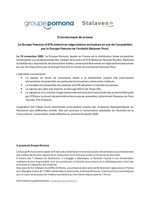 Le Groupe Pomona, leader en France de la distribution livrée de produits alimentaires aux professionnels des métiers de bouche et STB (Stalaven Teyssier Boutot), fabricant et distributeur de produits de charcuterie-traiteur, annoncent être entrés en négociations exclusives en vue de l’acquisition par le Groupe Pomona du fonds de commerce Stalaven Proxi.
