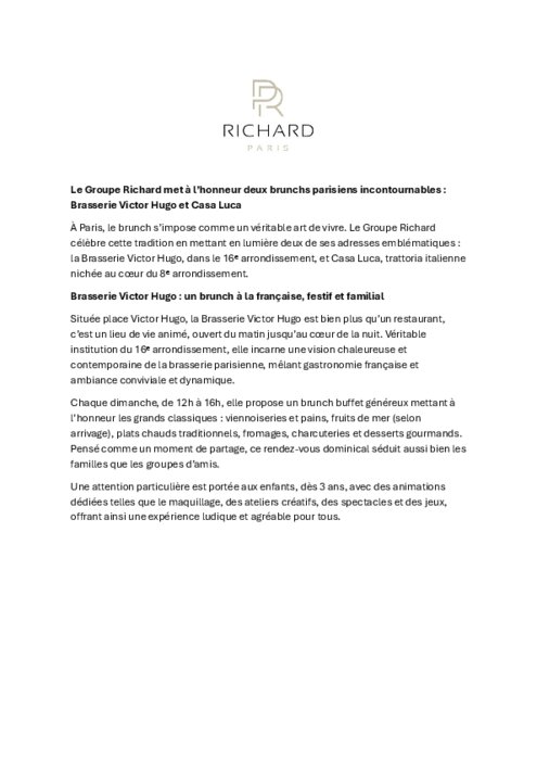 À Paris, le brunch s’impose comme un véritable art de vivre. Le Groupe Richard célèbre cette tradition en mettant en lumière deux de ses adresses emblématiques : la Brasserie Victor Hugo, dans le 16ᵉ arrondissement, et Casa Luca, trattoria italienne nichée au cœur du 8ᵉ arrondissement.