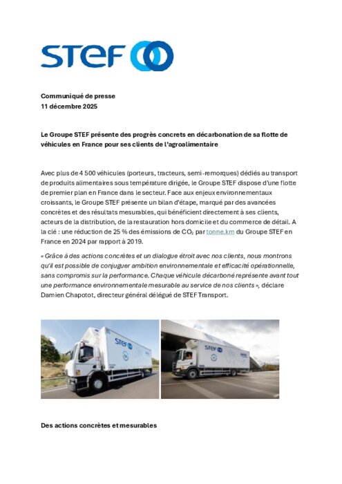 Avec plus de 4 500 véhicules (porteurs, tracteurs, semi-remorques) dédiés au transport de produits alimentaires sous température dirigée, le Groupe Stef dispose d’une flotte de premier plan en France dans le secteur. Face aux enjeux environnementaux croissants, le Groupe Stef présente un bilan d’étape, marqué par des avancées concrètes et des résultats mesurables, qui bénéficient directement à ses clients, acteurs de la distribution, de la restauration hors domicile et du commerce de détail. A la clé : une réduction de 25 % des émissions de CO2 par tonne.km du Groupe STEF en France en 2024 par rapport à 2019.