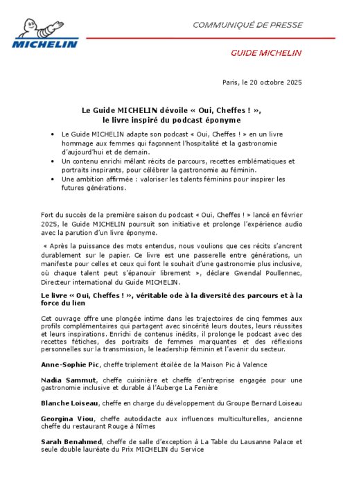 Métiers 21 octobre 2025 - 09:07 Fort du succès de la première saison du podcast « Oui, Cheffes ! » lancé en février 2025, le Guide Michelin poursuit son initiative et prolonge l’expérience audio avec la parution d’un livre éponyme. PDF (147 Ko) Télécharger