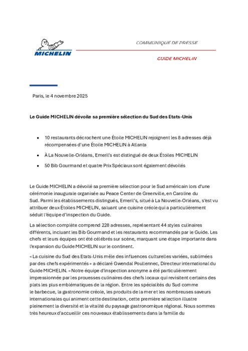 Le Guide Michelin a dévoilé sa première sélection pour le Sud américain lors d’une cérémonie inaugurale organisée au Peace Center de Greenville, en Caroline du Sud. Parmi les établissements distingués, Emeril’s, situé à La Nouvelle-Orléans, s’est vu attribuer deux Étoiles Michelin, saluant une cuisine créole qui a particulièrement séduit l’équipe d’inspection du Guide.