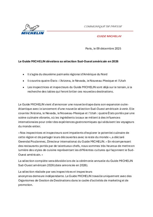 Le Guide Michelin vient d'annoncer une nouvelle étape dans son expansion outre-Atlantique avec le lancement d’une nouvelle sélection Sud-Ouest américain à venir. Elle couvrira l’Arizona, le Nevada, le Nouveau-Mexique et l’Utah : quatre États portés par une scène culinaire vibrante, où les ingrédients locaux se mêlent à des influences internationales pour créer des expériences gastronomiques qui séduisent les voyageurs du monde entier.