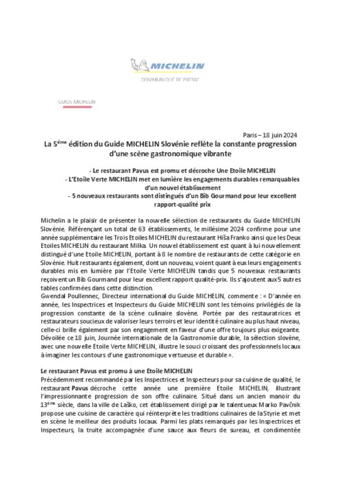 Michelin a le plaisir de présenter la nouvelle sélection de restaurants du Guide Michelin Slovénie. Référençant un total de 63 établissements, le millésime 2024 confirme pour une année supplémentaire les Trois Etoiles Michelin du restaurant Hiša Franko ainsi que les Deux Etoiles Michelin du restaurant Milka. Un nouvel établissement est quant à lui nouvellement distingué d’une Etoile Michelin, portant à 8 le nombre de restaurants de cette catégorie en Slovénie.