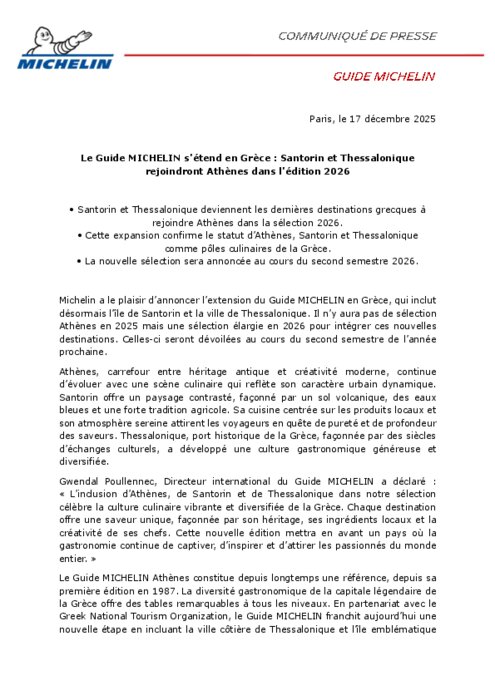 Michelin a le plaisir d’annoncer l’extension du Guide Michelin en Grèce, qui inclut désormais l’île de Santorin et la ville de Thessalonique. Il n’y aura pas de sélection Athènes en 2025 mais une sélection élargie en 2026 pour intégrer ces nouvelles destinations. Celles-ci seront dévoilées au cours du second semestre de l’année prochaine.