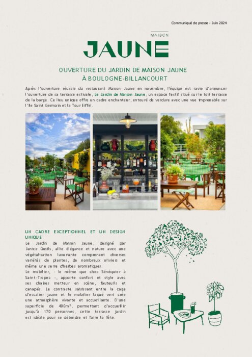 Après l’ouverture réussie du restaurant Maison Jaune en novembre, l'équipe est ravie d’annoncer l’ouverture de sa terrasse estivale, Le Jardin de Maison Jaune, un espace festif situé sur le toit terrasse de la barge. Ce lieu unique offre un cadre enchanteur, entouré de verdure avec une vue imprenable sur l’Ile Saint Germain et la Tour Eiffel.