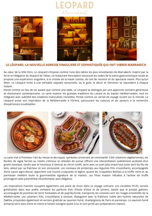 Au coeur de la Ville Ocre, Le Léopard s’impose comme l’une des tables les plus envoûtantes de Marrakech. Inspiré par la force et l’élégance du léopard de l’Atlas, ce restaurant d’exception bouscule les codes de la scène gastronomique locale et propose une expérience singulière, à la croisée de la haute cuisine, de l’art de recevoir et du spectacle vivant. Plus qu’un dîner, Le Léopard invite à une véritable odyssée sensorielle, où le goût, le décor et l’émotion se répondent à chaque instant.