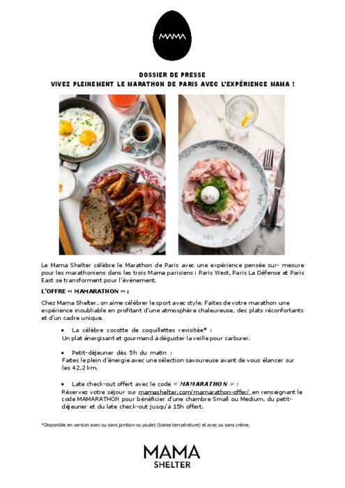 Restauration commerciale 25 mars 2026 - 09:56 Le Mama Shelter célèbre le Marathon de Paris avec une expérience pensée sur- mesure pour les marathoniens dans les trois Mama parisiens : Paris West, Paris La Défense et Paris East se transforment pour l’événement. PDF (396 Ko) Télécharger