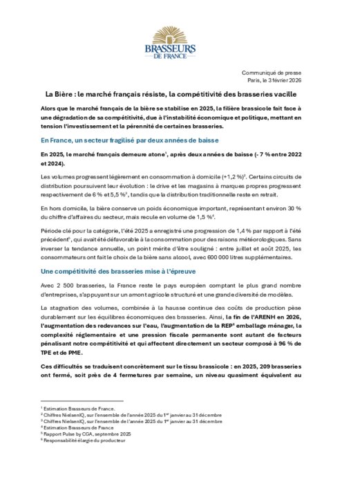 Alors que le marché français de la bière se stabilise en 2025, la filière brassicole fait face à une dégradation de sa compétitivité, due à l’instabilité économique et politique, mettant en tension l’investissement et la pérennité de certaines brasseries.