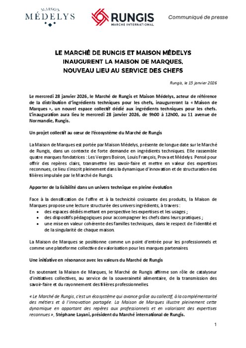 La Maison de Marques est portée par Maison Médelys, présente de longue date sur le Marché de Rungis, dans un contexte de forte demande en ingrédients techniques. Elle rassemble quatre marques fondatrices : Les Vergers Boiron, Louis François, Prova et Médelys. Pensé pour offrir des repères clairs, transmettre les savoir-faire et mettre en valeur des expertises reconnues, ce lieu s’inscrit pleinement dans la dynamique d’innovation et de structuration des filières impulsée par le Marché de Rungis.