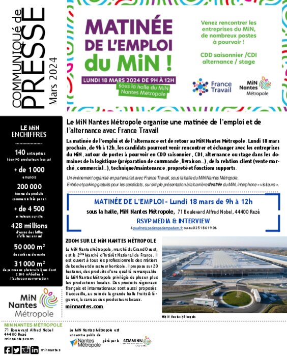 La matinée de l’emploi et de l’alternance est de retour au MiN Nantes Métropole. Lundi 18 mars, de 9h à 12h, les candidats pourront venir rencontrer et échanger avec les entreprises du MiN, autour de postes à pourvoir en CDD saisonnier, CDI, alternance ou stage dans les domaines de la logistique (préparation de commande, livraison…), de la relation client (vente marché, commercial…), technique/maintenance, propreté et fonctions supports.