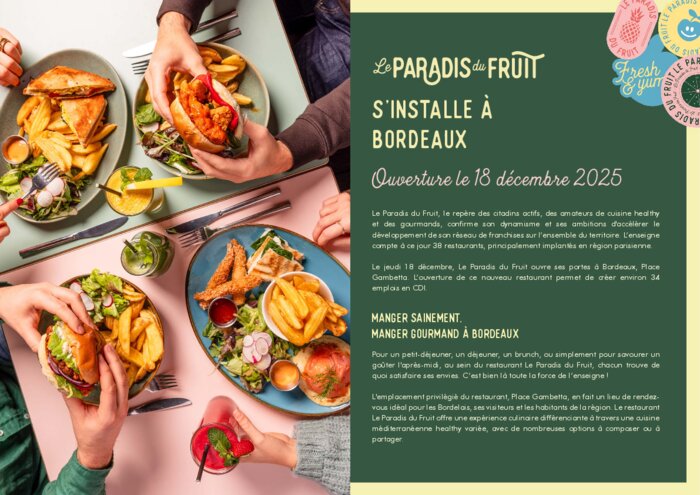 Le Paradis du Fruit, le repère des citadins actifs, des amateurs de cuisine healthy et des gourmands, confirme son dynamisme et ses ambitions d’accélérer le développement de son réseau sur l’ensemble du territoire. L’enseigne compte à ce jour 38 restaurants, principalement implantés en région parisienne.