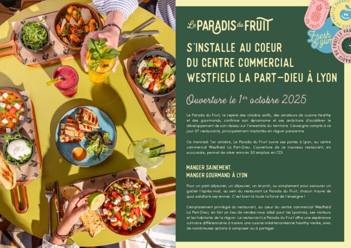 Le Paradis du Fruit, le repère des citadins actifs, des amateurs de cuisine healthy et des gourmands, confirme son dynamisme et ses ambitions d’accélérer le développement de son réseau sur l’ensemble du territoire. L’enseigne compte à ce jour 37 restaurants, principalement implantés en région parisienne. Ce mercredi 1er octobre, Le Paradis du Fruit ouvre ses portes à Lyon, au centre commercial Westfield La Part-Dieu. L’ouverture de ce nouveau restaurant, en succursale, permet de créer environ 50 emplois en CDI.