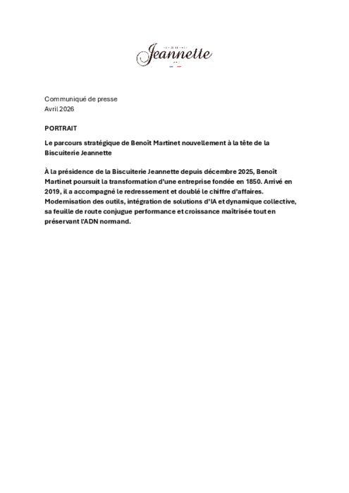 À la présidence de la Biscuiterie Jeannette depuis décembre 2025, Benoît Martinet poursuit la transformation d’une entreprise fondée en 1850. Arrivé en 2019, il a accompagné le redressement et doublé le chiffre d’affaires. Modernisation des outils, intégration de solutions d’IA et dynamique collective, sa feuille de route conjugue performance et croissance maîtrisée tout en préservant l'ADN normand.
