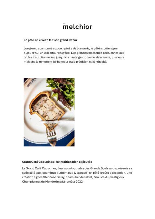 Longtemps cantonné aux comptoirs de brasserie, le pâté-croûte signe aujourd’hui un vrai retour en grâce. Des grandes brasseries parisiennes aux tables institutionnelles, jusqu’à la haute gastronomie alsacienne, plusieurs maisons le remettent à l’honneur avec précision et générosité.