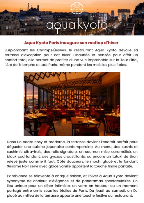 Surplombant les Champs‑Élysées, le restaurant Aqua Kyoto dévoile sa terrasse d’exception pour cet hiver. Chauffée et pensée pour offrir un confort total, elle permet de profiter d’une vue imprenable sur la Tour Eiffel, l’Arc de Triomphe et tout Paris, même pendant les mois les plus froids.