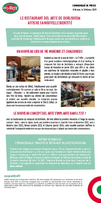 Implanté au cœur de la zone de loisirs « Le Trèfle », à proximité d’un grand complexe cinématographique et d’un bowling, le restaurant Del Arte de Dorlisheim a entrepris d'importants travaux de rénovation en janvier 2024 pour offrir à ses clients une expérience de restauration renouvelée et adaptée à leurs attentes.