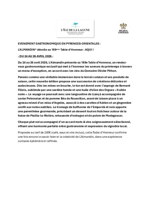 Le restaurant étoilé L'ALMANDIN à Saint-Cyprien dévoile sa 189e Table d'Honneur