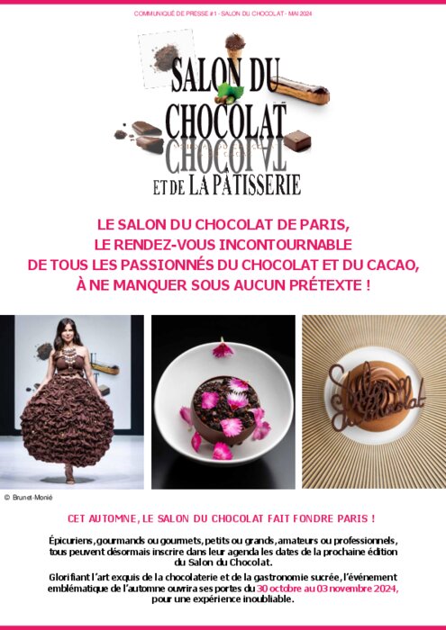 Les organisateurs du Salon du Chocolat de Paris sont ravis d'annoncer sa 29e édition. Le plus grand événement mondial dédié au chocolat s'installera au Pavillon 5 de la Porte de Versailles du 30 octobre au 3 novembre . À l'approche des 30 ans du Salon du Chocolat, cette édition sera placée sous le signe du « temps ». Par ailleurs, cette année, un nouvel espace célèbrera le travail de nos voisins : la Grand'Place, où se retrouveront notamment suisses et belges, sous l’égide commune et gourmande qui les animent tous : le chocolat !