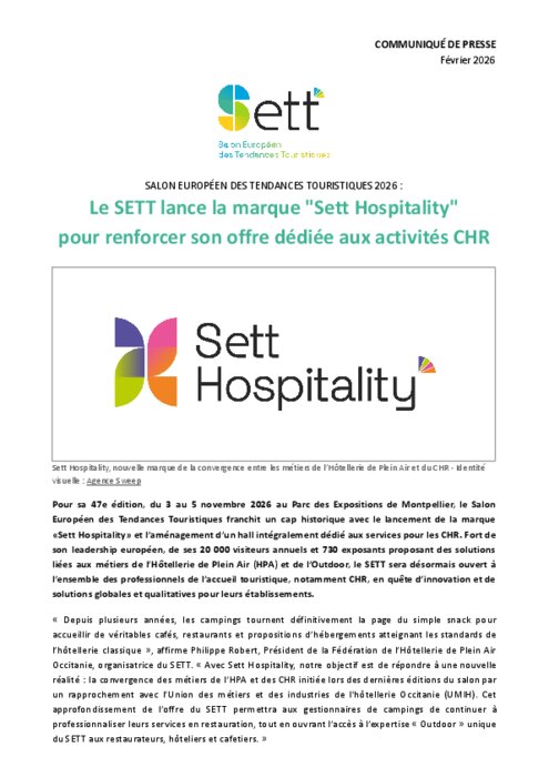 Pour sa 47e édition, du 3 au 5 novembre au Parc des Expositions de Montpellier, le Salon Européen des Tendances Touristiques franchit un cap historique avec le lancement de la marque «Sett Hospitality» et l’aménagement d’un hall intégralement dédié aux services pour les CHR. Fort de son leadership européen, de ses 20 000 visiteurs annuels et 730 exposants proposant des solutions liées aux métiers de l’Hôtellerie de Plein Air (HPA) et de l’Outdoor, le SETT sera désormais ouvert à l’ensemble des professionnels de l’accueil touristique, notamment CHR, en quête d’innovation et de solutions globales et qualitatives pour leurs établissements.