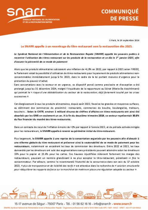 Le Syndicat National de l’Alimentation et de la Restauration Rapide (SNARR) appelle les pouvoirs publics à recentrer l’utilisation des titres-restaurant sur les produits de la restauration et ce dès le 1er janvier 2025, afin d’assurer la pérennité de ce mode de paiement.